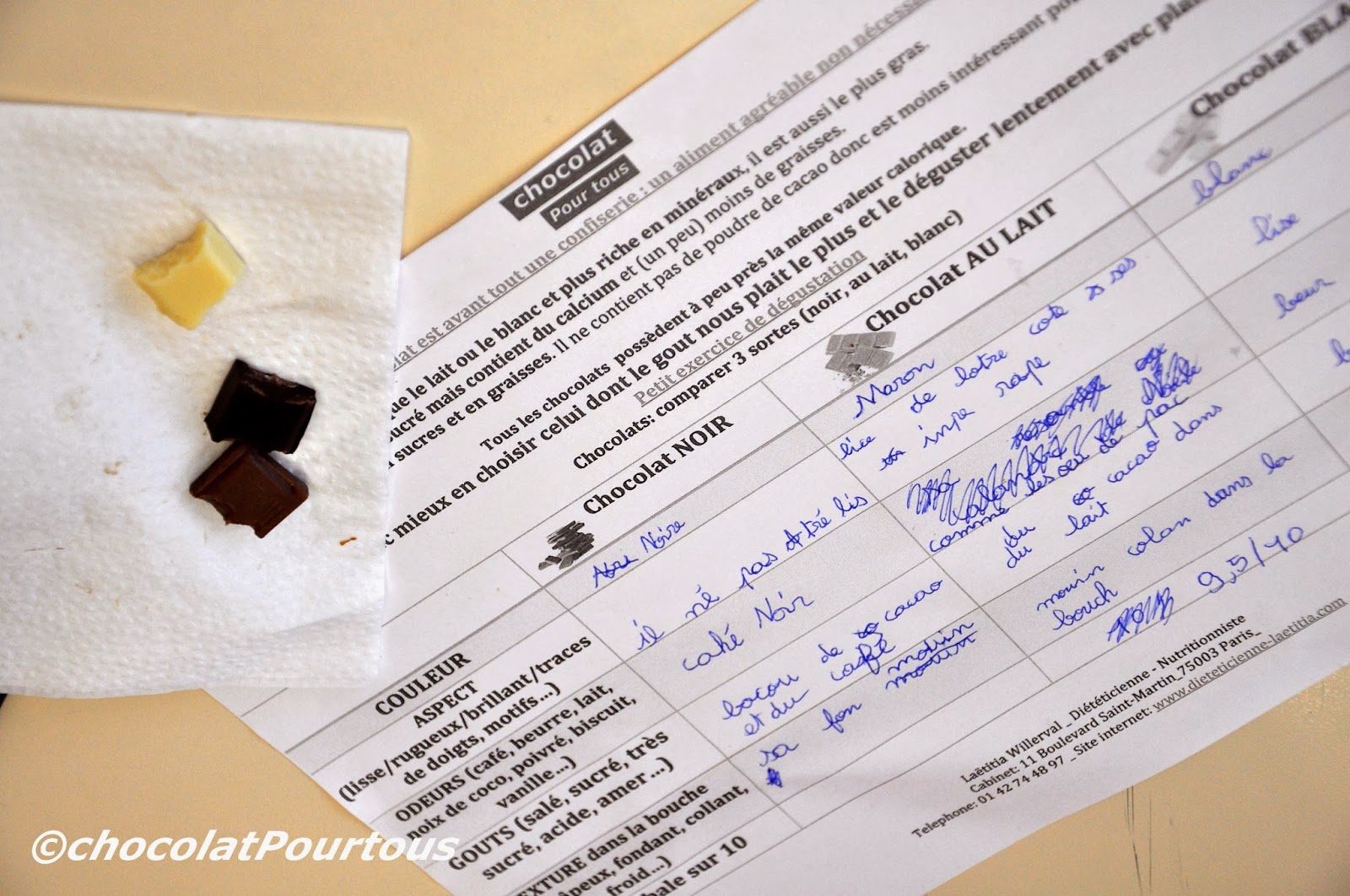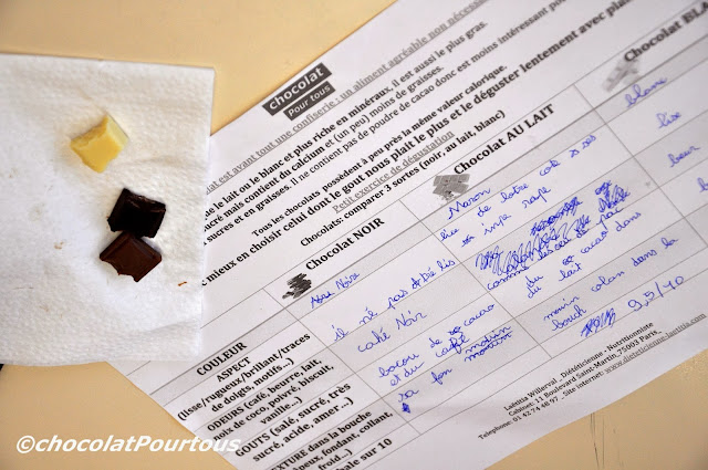 Une fois en bouche les enfants ont trouvé des saveurs très différentes en fonction de la teneur en beurre de cacao, en sucre et en lait pour ensuite attribuer une note sur 10 aux différentes sortes de chocolats.